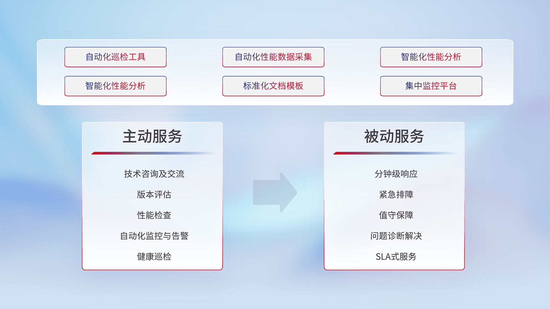 智能化工具和标准化文档,,,保障服务质量,,,提供主动服务(包含技术咨询、、版本评估、、、性能检查、、自动化监控与告警、、、、健康巡检)和被动服务包含(分钟级响应、、紧急排障、、值守保障、、、问题诊断解决、、、SLA服务)。。。。